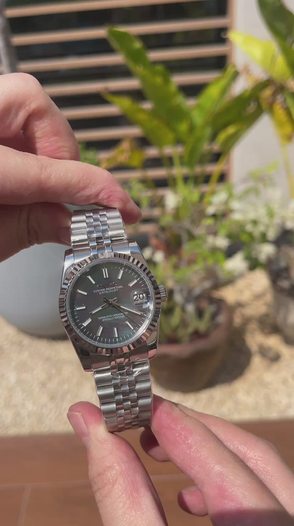 36mm Seiko mod Datejust with a stunning iridescent pearl dial, fluted bezel, and Jubilee bracelet — a timeless classic with luxury vibes at a fraction of the price.